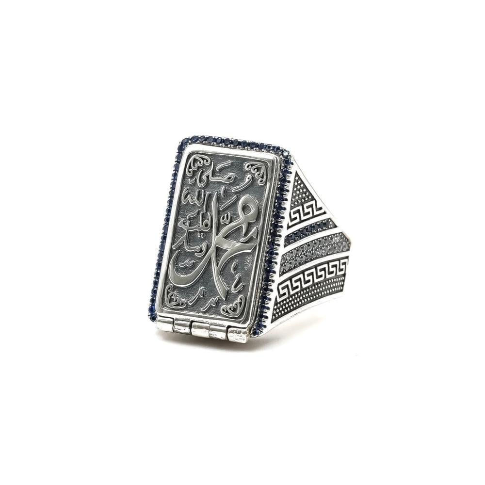 خاتم ديني رجالي فضة 925 بتصميم أنيق ونقشة مختلفة تحمل نقشة محمد رسول الله. لا يسبّب الحساسية وخالٍ من الرصاص والنيكل. يأتي مع تغليف فاخر وكرت إهداء لكتابة عبارتك، مع ضمان تغيّر اللون مدى الحياة. للمقاس المناسب يُرجى التواصل معنا.