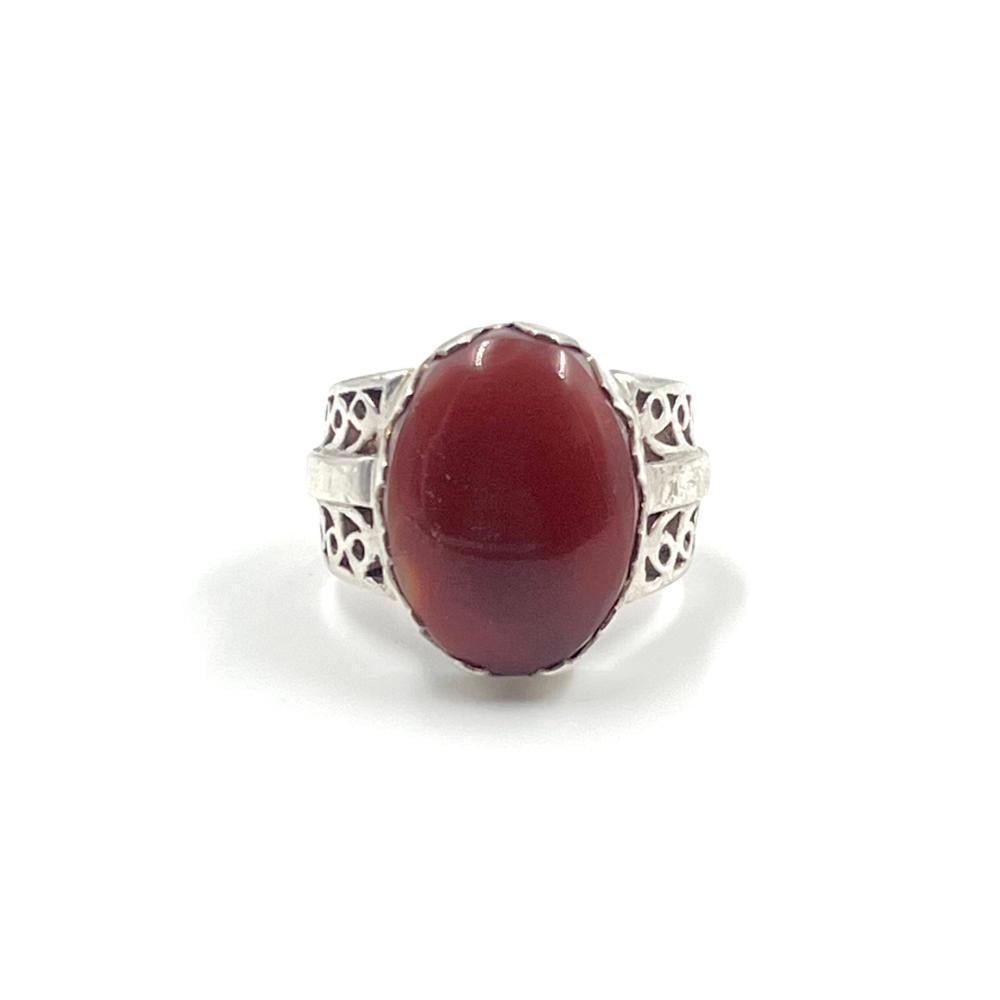 خاتم فضة عيار 925 بتصميم أنيق ونقشة مختلفة يتوسطه حجر عقيق كبدي يمنحك شعورًا بالتميّز والأناقة. لا يسبب الحساسية وخالٍ من الرصاص والنيكل. يصل بتغليف فاخر مناسب للإهداء مع كرت لكتابة عبارتك الخاصة. لضبط المقاس بدقة، يُرجى التواصل معنا. يشمل ضمان مدى الحياة على تغيّر لون الفضة.